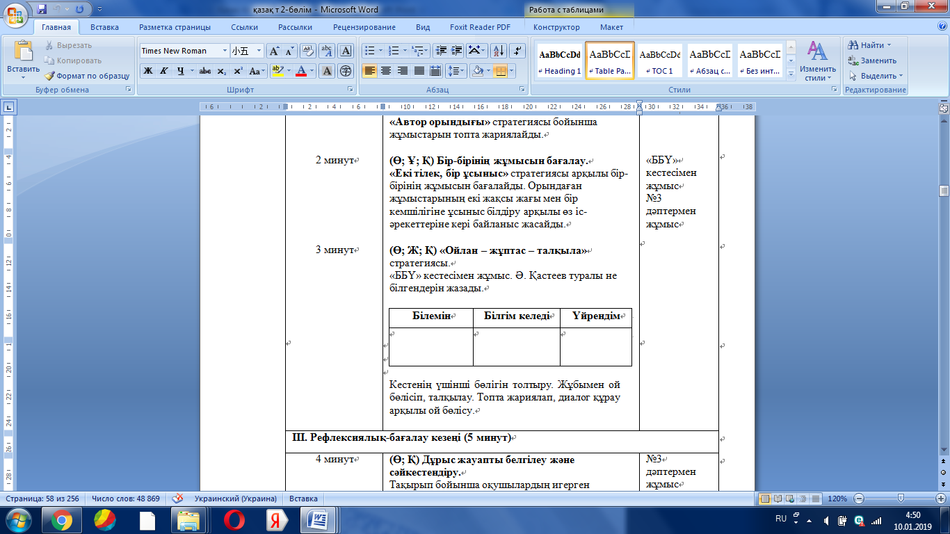 Рапорт беру. Психологиялық ахуал қалыптастыру.(Ұ) Оқушылар шеңбер құрып, өлеңді хормен айту арқылы бір-бірлерімен амандасады. Қайырлы күн, күнім, далам, орманым, Қайырлы күн, гүлім, құсым, көлдерім, Қайырлы күн, өсімдіктер, жəндіктер, Қайырлы күн, барша тіршілік иесі. «Жалаулар» арқылы топқа бөлінеді. Оқушыларды қалаған жалауларын алып, 1,2,3 топтарға бөлініп отырады. 1-топ «Бақыт жалаулары» 2-топ «Арман жалаулары» 3-топ «Қуаныш жалаулары» Жұмыс ережесін келісу. Алдыңғы білімді еске түсіру (ұжымда) (Ө; Ж) «Ойлан – жұптас – талқыла» стратегиясы. «ББҮ» кестесімен жұмыс. Ә. Қастеев туралы не білетіндерін, не білгісі келетіндерін жазады. ҚБ: Отшашу арқылы бір-бірін бағалау. Оқу мақсатын таныстыру. Күтілетін нәтижені анықтау |