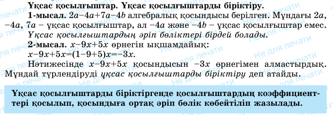 \Алгебралық өрнектегі ұқсас мүшелерді анықтайды; \Ұқсас мүшелерді біріктіру ережесін қолданады; \Өрнектерді ықшамдап жаза алады |