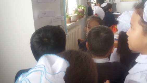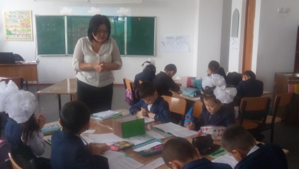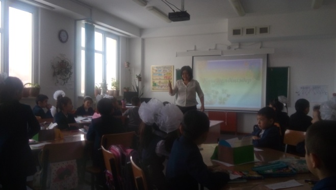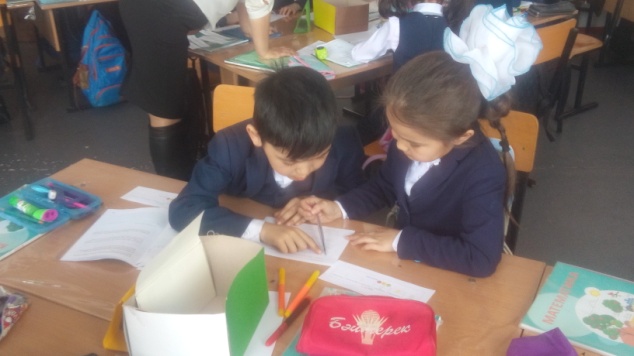 Сабақты оқушылармен 1 шумақ өлең айтудан бастадым. Өлең айтқыза отырып, оқушылардың көңіл-күйін көтеріп, жағымды ахуал тудырдым. 4топқа бөліп,топта жұмыс жасау ережесін айтқыздым.