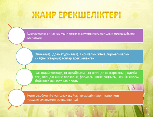 Әдебиет теориясы. Оқушылар жанр, фабула, сюжет деген терминдер бойынша талдау жұмысын жүргізеді.