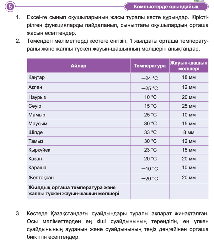 Дескриптор -топтаса отырып, Excel-де функциялар ды қолданып, тапсырманы орындайды. -2 балл Дескриптор -Excel-ге сынып оқушыларынын жасы туралы кесте құрайды Кірістерілген функцияларды қолданып сыныптын орташа жасын есептейді, -2 балл. Дескриптор -Excel-де 1 жылдағы жауын-шашын туралы кесте құрайды. Кірістерілген функцияларды қолданып жауын шашынның орташа мөлшерін есептейді, -2 балл. Дескриптор -Сұраққа жауап береді -2балл |