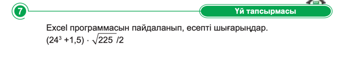 8.2.2.3 электрондық кестелерді қолдану арқылы есептерді шешу үшін кірістірілген функцияларды пайдалану. |