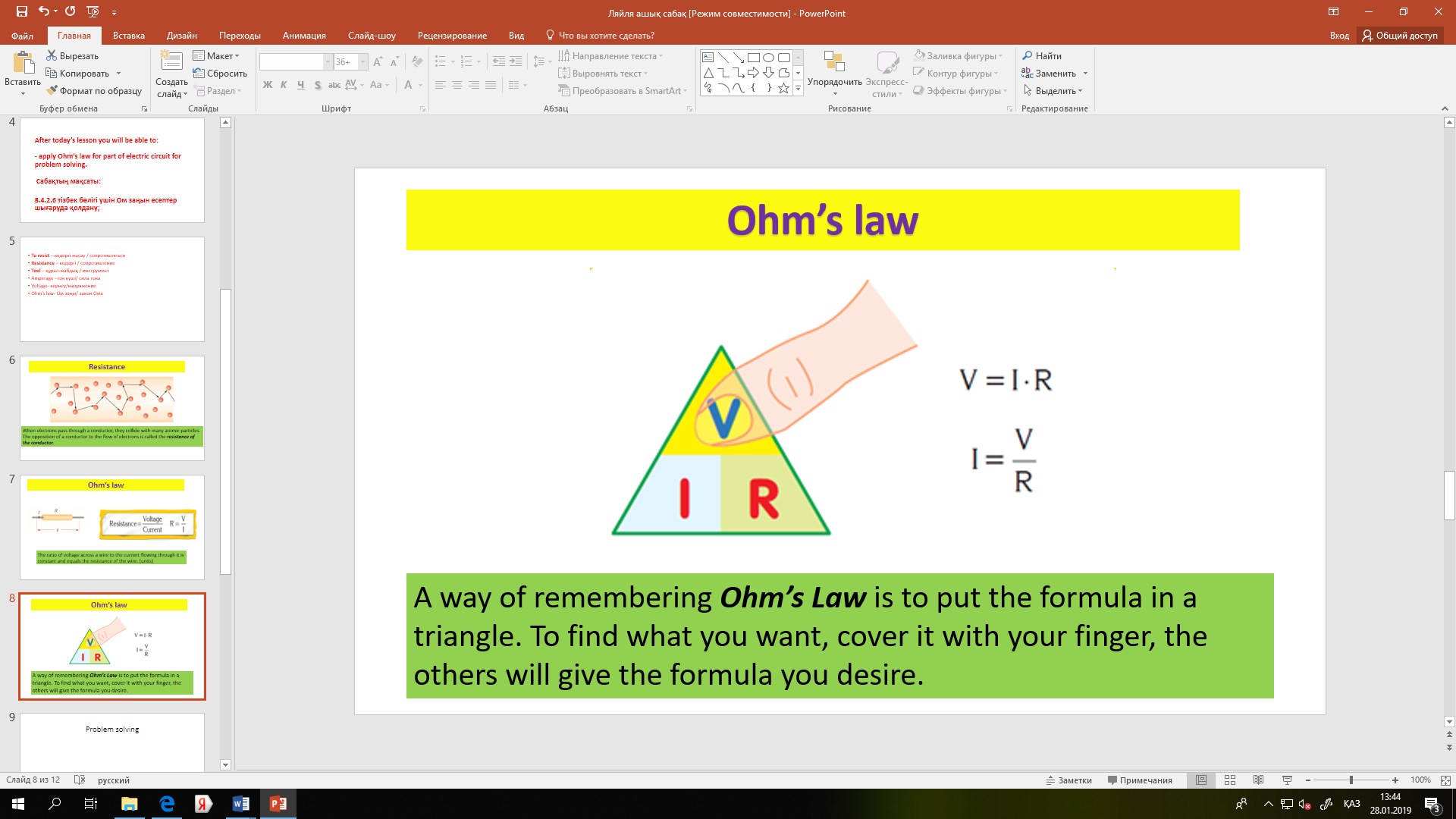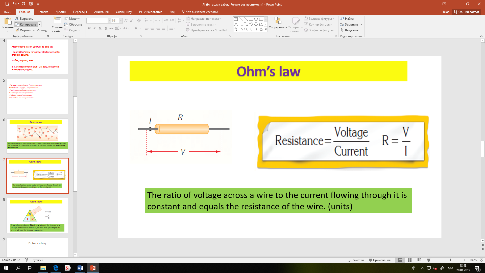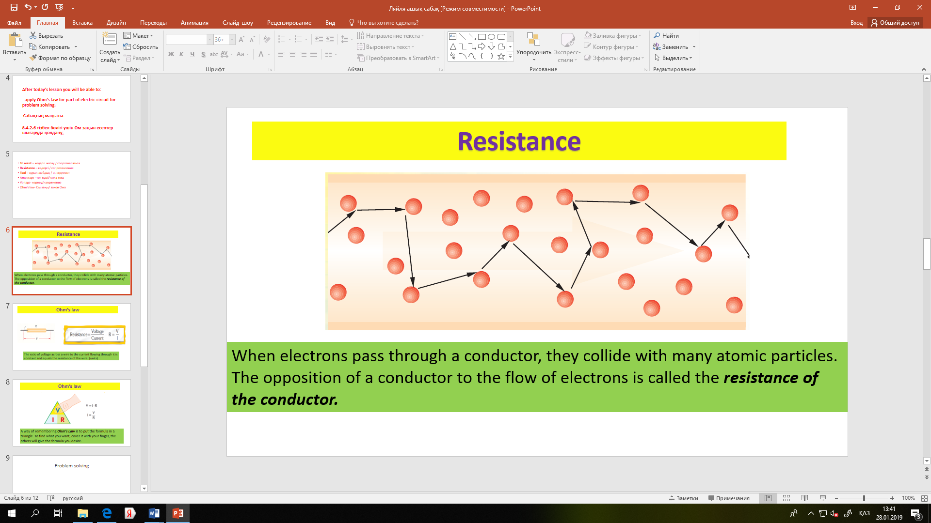 Сөздікпен жұмыс. To resist – кедергі жасау / сопротивляться Resistance – кедергі / сопротивление Tool – құрал-жабдық / инструмент Amperage –ток күші/ сила тока Voltage- кернеу/напряжение Ohm’s law- Ом заңы/ закон Ома These the terminology of our lesson. So repeat after me. ІІІ. Жаңа сабақ түсіндіру. Видео көрсету. Сол видеодан түсінгендерін айту. Оқушыларға тақырыпқа сай бейнеролик корсетіледі. Заңның тұжырымдамасы мен тәжірибесімен танысады. All of you look at the board we will watch a video. Watch the video carefully. Ом заңынан U=I*R шамасын анықтауға болады. Тізбек бөлігіндегі кернеу осы бөліктің кедергісіне тура пропорционал. Кедергіні өлшейтін құрал: резистор (кедергі), реостат. Тізбектің бойымен өтетеін тоққа өткізгіштің кедергі жасау қасиетін сипаттайтын R шаманы кедергі деп атайды. Ток күшінің кернеу мен кедергіге тәуелділік заңын 1827 жылы. Г.Ом ашты.
