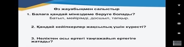 Сабақты бекіту тапсырмалары. Білімді тиянақтау мақсатында мұғалім оқушыларға сұрақтарға ауызша жауап беруді ұсынады. Тапсырма орындау барысында бағыт бағдар беріп, қолдау көрсетеді. 1.Ертегідегі негізгі ой жақсылықтың жеңуі? Қандай кейіпкерлер жақсылық үшін күресті? Ойлан «Қатені тап» әдісі Шырағым,өзің ал.Кәріліктен отырсам,отыра алмаймын,тұрсам,тұра алмаймын. |