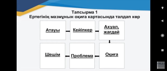 (Ж.Ж) 2.тапсырма. «... ..., енді не болар еді?» әдісі (Болжау) Оқылым Оқушылардың бірі қиялмен бір ситуация айтады, қалғандары соның шешімін тауып жалғастыру керек. Мысалы, «Сонда кемпір аузын ашса, бір-ақ тісі қалыпты. Кемпір бәйтеректің түбін қаза-қаза құлатуға жақындайды .....» ары қарай не болады деп ойлайсыңдар . Мақсаты:Бұл тәсіл білім алушылардың қиялын дамытып, мидың ойлау белсенділігін арттырады. Тапсырмалар арқылы саралау. Шығарма мазмұнын толықтай еске түсіру үшін шығарманың аудио нұсқасы ұсыналады. 3 -тапсырма:Ертегі мазмұнын оқиға картасымен талдап көрейік . Топтық жұмыс: «Оқиға картасын талдау» әдісі