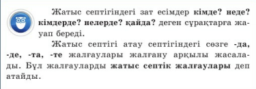 Барлық оқушылар: зат есімнің септелу жүйесін біледі Көптеген оқушылар: сөйлемдегі септік жалғауларын таба алады. Кейбір оқушылар: сөйлеу кезінде септік жалғауларын дұрыс қолданады. |