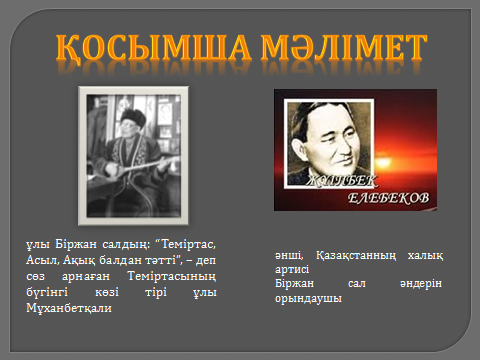 Сабақтың тақырыбы: Біржан сал Қожағұлұлы «Сырғақты», «Жанбота»,