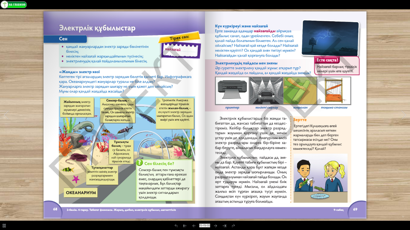Дескриптор: қандай жануарлардан электр заряды бөлінетінін біледі. неліктен найзағай жарқылдайтынын түсінеді. электрленудің қалай пайдаланылатынын анықтайды. ҚБ: Бас бармақ арқылы бір-бірін бағалау. Жұмыс дәптеріндегі жазылым тапсырмаларын орындау Жаңа білім мен тәжірибені қолдану Топтық жұмыс. «Галлерияда ой шарлау» Берілген тақырыпта топтық жұмысы жүргізіліп, әр топтың жұмысы қабырғаға ілінеді де, оқушылар жүріп, аралап, оған әр оқушылар кішкене жапсырма қағазға бағасын беріп, пікірін жазып жабыстырып кетеді. Ең жақсы баға алған топтың жұмысы қаралады. (ҚБ) “Екі жұлдыз, бір тілек” әдісі. |