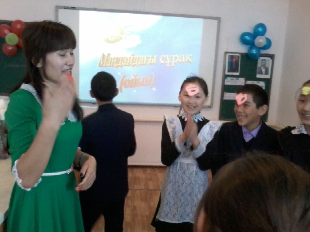 Оқушылардың басында сөздер жазылған қағаз болады. Соны жасырып ымдап, тұспалдайды. Оқушы өз басындағы жазудың не екенін айтып беру керек.