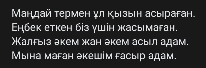 Зейнеп: «Әке» деген сөз қандай жақын, қандай ыстық десеңші!. Өмірде әкесін жақсы көрмейтін бала жоқ шығар, өйткені бала үшін әкенің орны бөлек қой. Тақпақтар. Дильназ Әкешімсіз қолдайтын, Жамандықтан қорғайтын. Ұл-қызына әспеттеп, Бар жақсысын жолдайтын Муслима Әке сен, жансың биік, дана тұлғаң. Мейірім,нұры менен жаратылған, Бар әлемнің, жақсылығын бойға жыйған, Менің әкем, мен үшін, дара туған. Мәди Сіз бар кезде әкешім, Арайлы боп таң атар. Күн күлімдеп біздерге, Қуанышпен үн қатар. Ортамызда жүрші аман, Әніміз боп жырлатар! Ардақ Аташым менің тірегім. Көп берер сенің тілегің. Атыңды сенің ардақтап, Жүремін әр кез мақтанып Маржан Менің атам ақылды Бізге бата береді, Арқасына мінгізіп Аттай шауып,желеді! Зарина