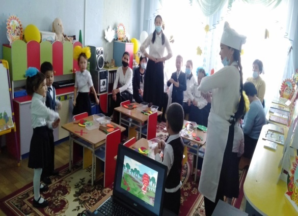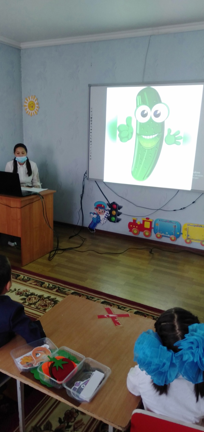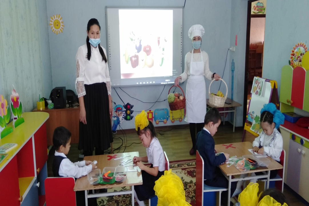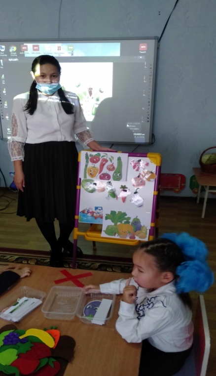Қолданылатын көрнекі құралдар: көкөкністер ме жемістер, интерактивті тақта, себеттер, балаларға үлестірмелі материалдар