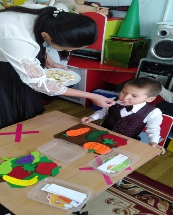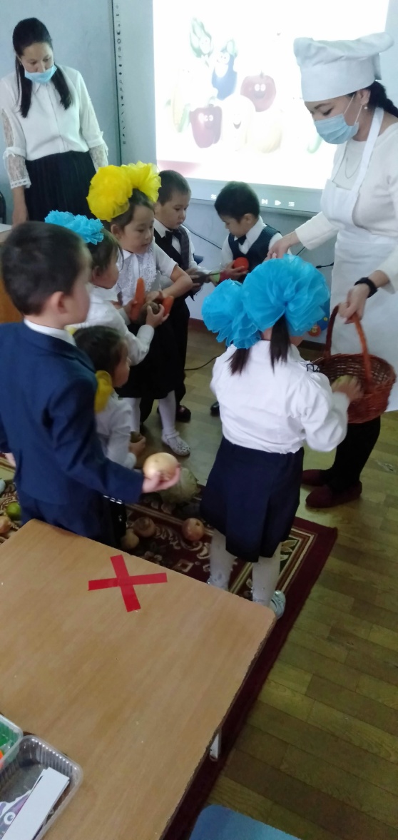 Аспазшы келеді. Бақтағы, бақшадағы теріп әкелген жемістері мен көкөністерін байқаусызда төгіп алады. Балалардан көмек сұрайды Дидактикалық ойын: «Жемістер мен көкөністер» Шарты: 1 себетке көкөністерді, 1 себетке жемістерді жинау керек.