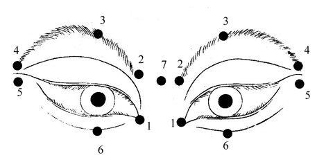 Алдымен екі саусақпен (балаң үйрек және ортан терек) көзіңіздің алмасын сегіз рет басыңыз, ауыратындай қатты басуға болмайды. Сонан кейін суретте көрсетілген нүктелерге екі реттен басып шығыңыз.