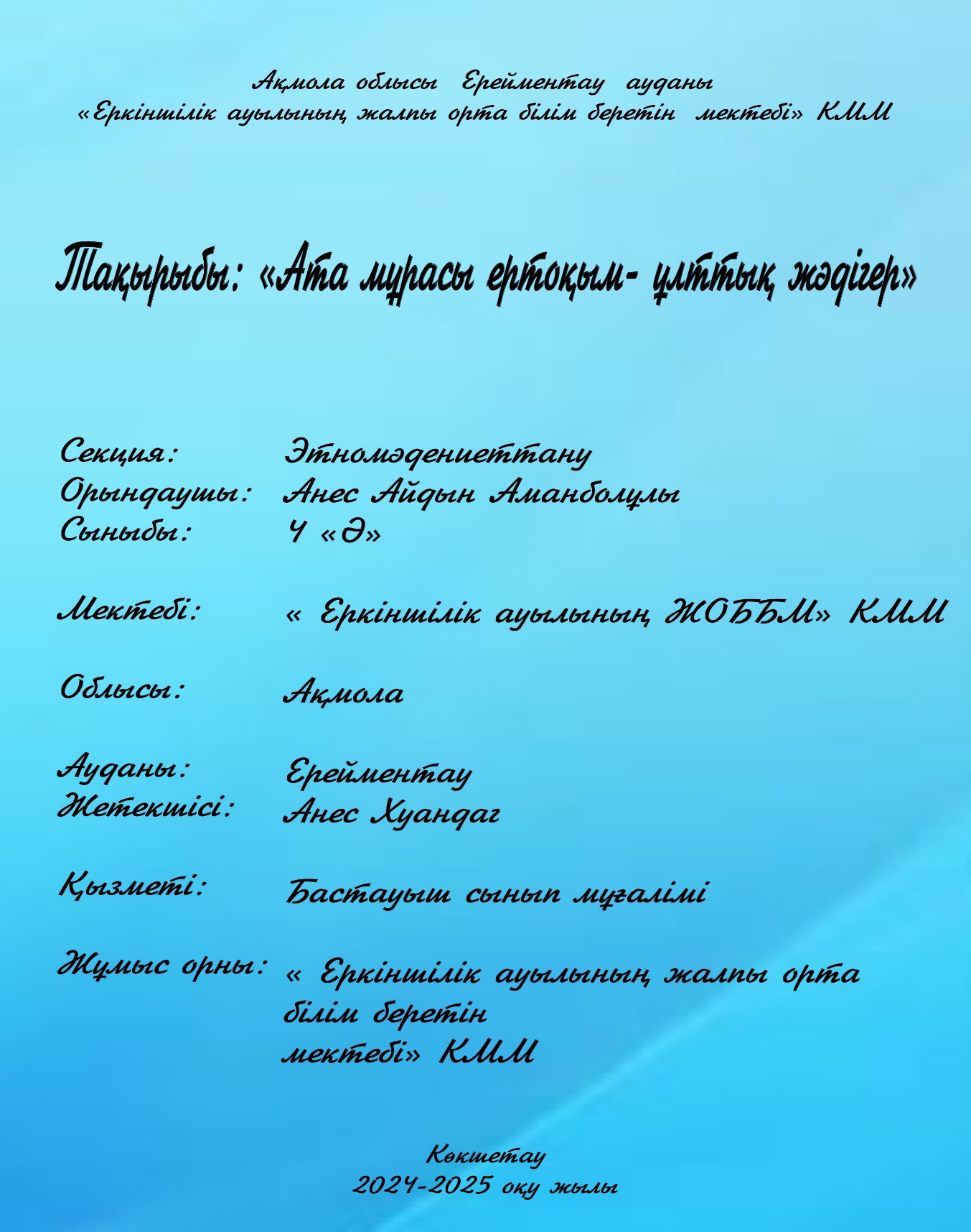 Ақмола облысы Ерейментау ауданы «Еркіншілік ауылының ЖОББ мектебі » КММ 4 «ә» сынып оқушысы Анес Айдын