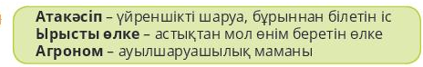 Дескриптор: Сөздікті жазып, жаттайды-1балл. -«Мәтінді оқиды-1балл. - Күрішші Ы.Жақаев туралы әңгімелейді-1балл. Дескриптор: - Аңыздың мазмұнын берілген етістіктермен қысқаша әңгімелейді-2балл. - Кейіпкердің іс-әрекеті мен көңіл күйі не себепті өзгергенін түсіндіреді-1балл. - Мәтіндегі жер, су аттарын картадан іздеп табады-1балл. Таңдаған дәнді дақылына таныстырылым жасайды-2балл. -Күріштің ерекшелігі, пайдасы туралы қорытындылайды-1балл. |