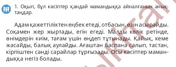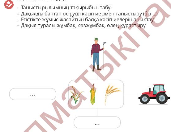 Ә) Сұрақ-жауап. -Кейіпкердің іс-әрекеті мен көңіл күйі не себепті өзгергенін түсіндіріңдер. -«Әке, мен күрішші боламын!» деген Мақсұт қай мамандықтың иесі болды? Б) Картамен жұмыс. -Мәтіндегі жер, су аттарын картадан іздеңдер. В) Таныстырылым. -Таңдаған дәнді дақылдарыңа таныстырылым жасаңдар.