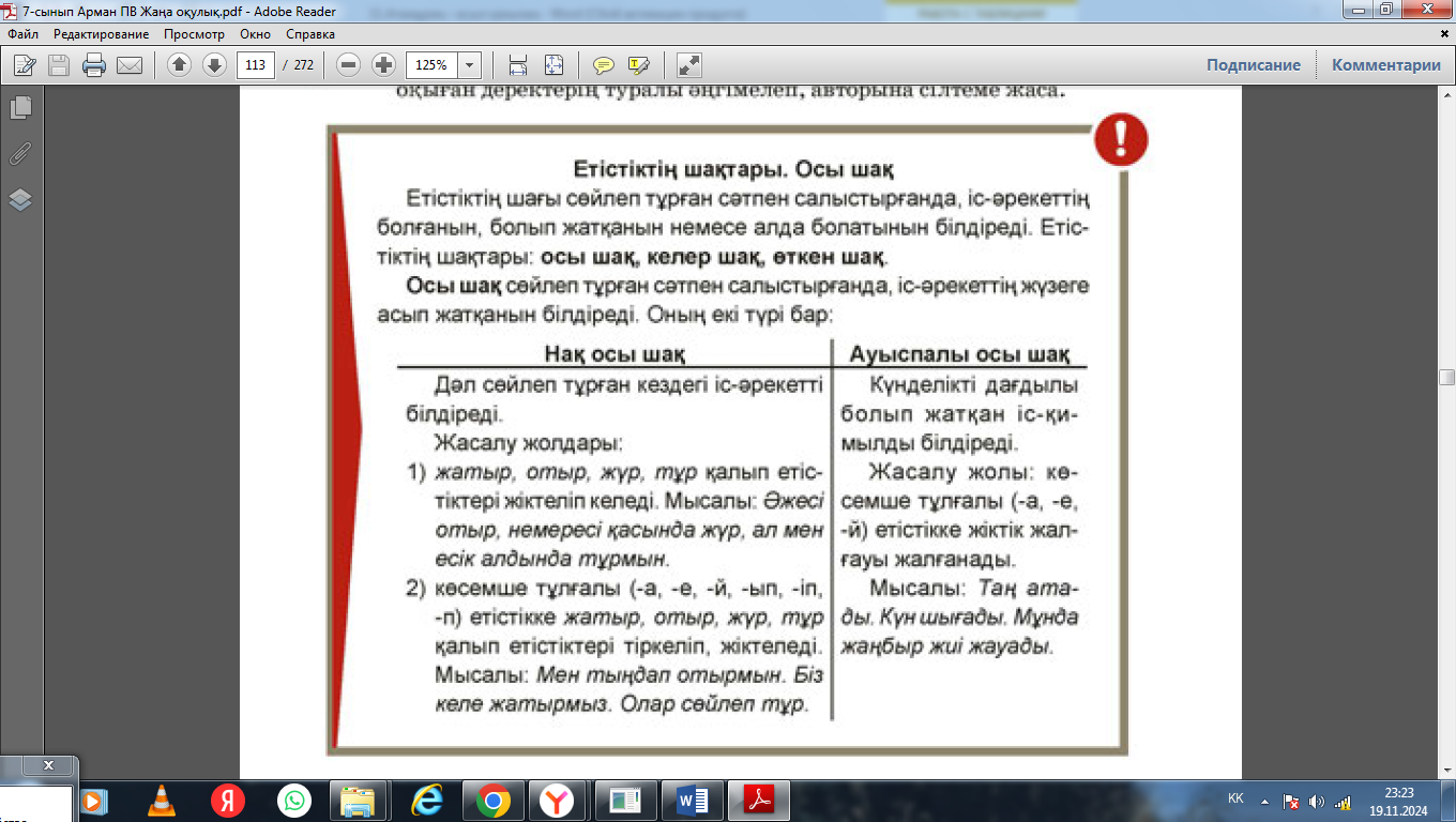 Оқушылар ережені оқып, жұппен талқылайды, «Түртіп алу» әдісі бойынша осы шақ етістіктерінің жасалу жолдарын дәптерге жазады.