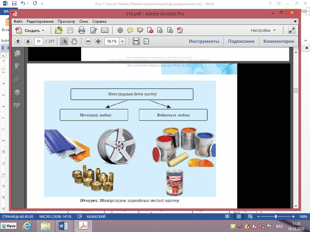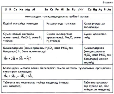 8.2.4.1 -кейбір металдар басқаларға қарағанда тотығуға тезірек ұшырайтындығын білу; 8.2.4.2 -белсенді металдардың салқын сумен, ыстық су немесе бумен әрекеттесуін сипаттау; 8.2.4.3 -металдар коррозиясын туындатуға әсер ететін жағдайларды зерттеу; |