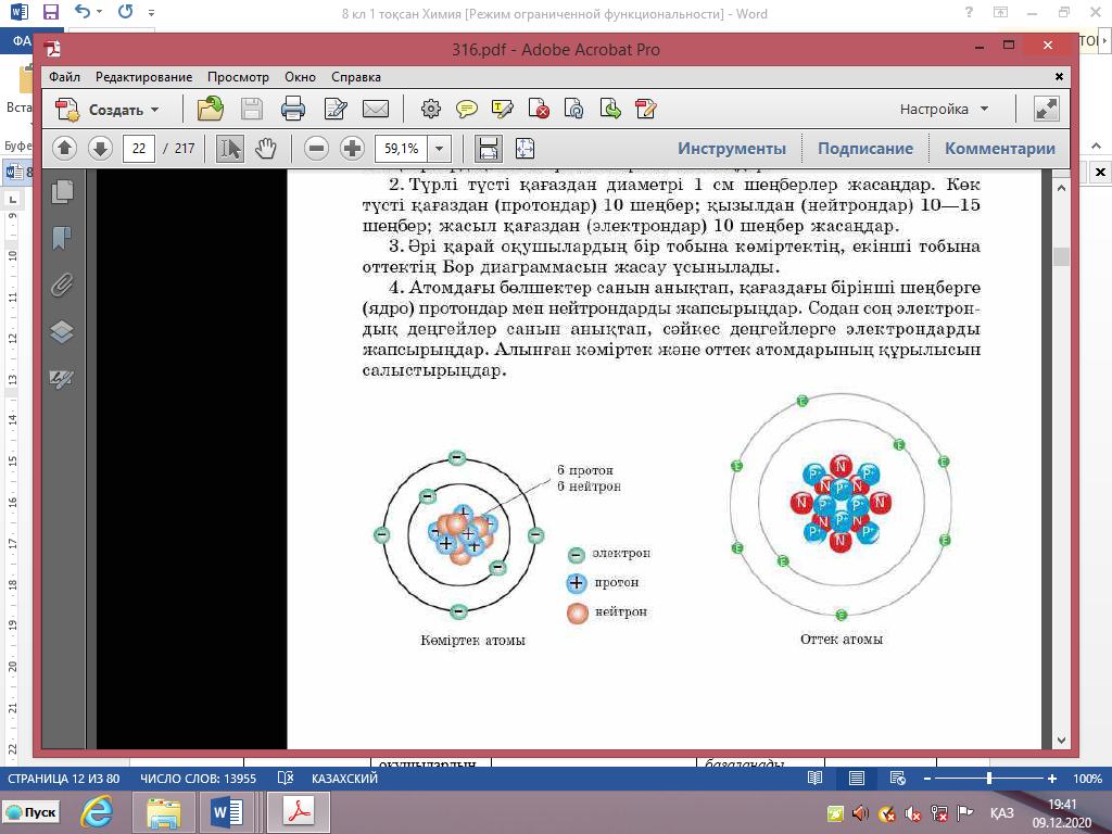 Тапсырма 2. Алғашқы 20 элементтің атомдарында электрондардың орналасуын суреттеу. Мұғалім тақтада бір атомның электрондарының орналасуын көрсетеді.