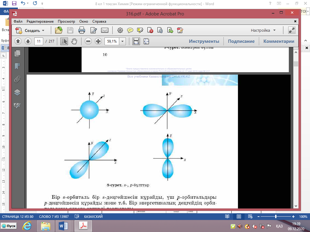 8.1.3.2 -әрбір электрон қабатында электрон саны нақты максимал мәннен аспайтынын түсіну 8.1.3.3-s және р орбиталдарының пішінін білу 8.1.3.4 -алғашқы 20 химиялық элементтің электрондық конфигурациясын және электронды – графикалық формуларын жаза білу |