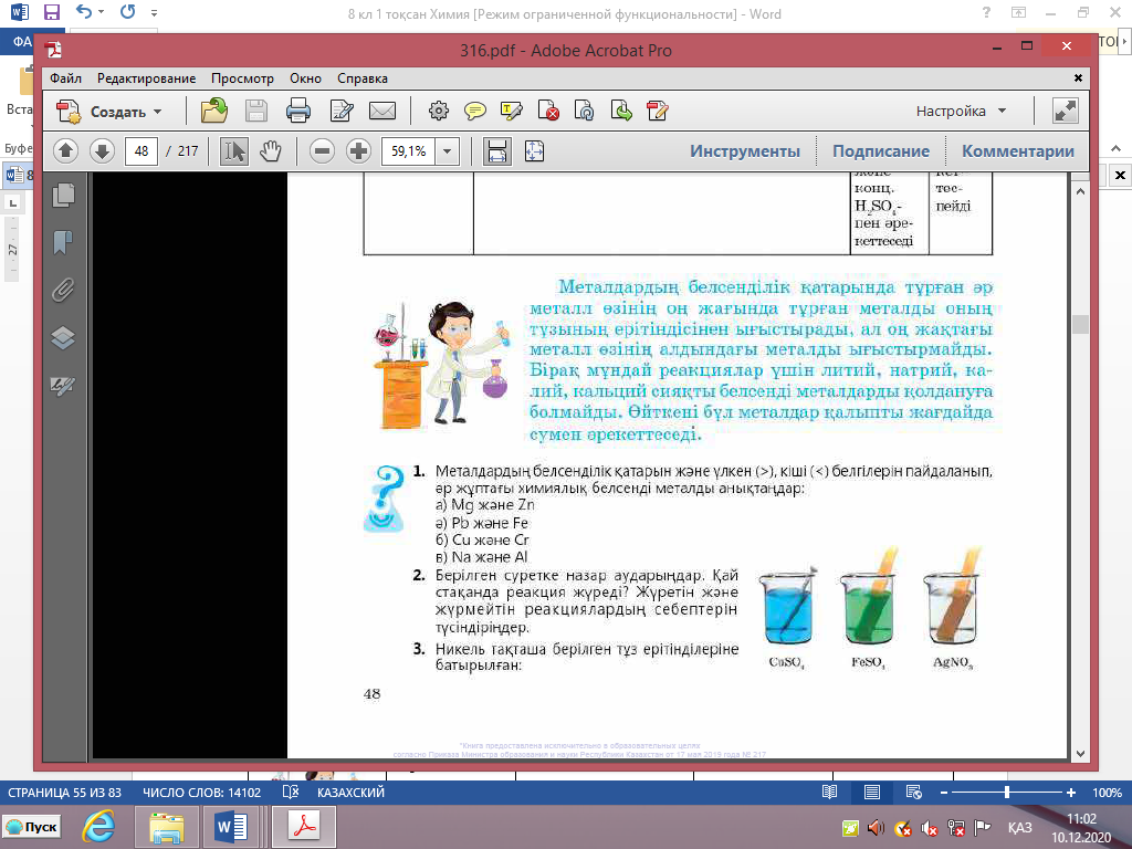 8.2.4.7 -эксперимент нәтижесі бойынша металдардың белсенділік қатарын құру және оны анықтама мәліметтерімен сәйкестендіру 8.2.4.8-металдардың белсенділік қатарын қолданып металдардың таныс емес орынбасу реакцияларының жүру мүмкіндігін болжау |