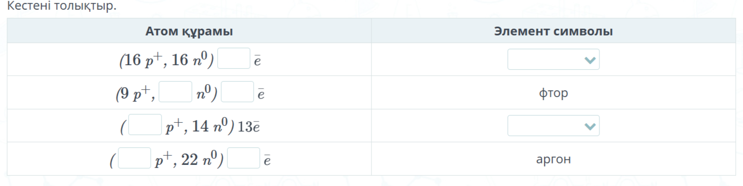 -протон, электрон, нейтронды және оларды және олардың атомдағы орналасу тәртібін, массасын зарядын біледі -алғашқы 20 элементтің атом құрылысы мен атом ядросының құрамын анықтайды |