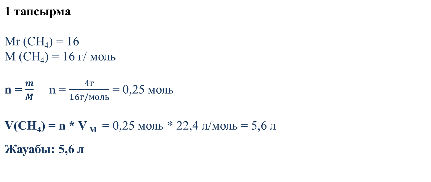 1 тапсырма Массасы 4 г метан (CH4) газының көлемін қ.ж табыңыз. Жауабы: