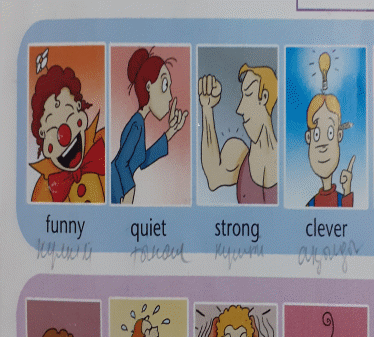 Pupils approach the teacher. Take paper which is to divide them into two groups. Students come here and take the paper where your written group names. The first group is the Flintstone family. The second group is the Rubbles family Let’s start our lesson Check this today’s New words: Weak - әлсіз Silly- ақымық Noisy- шулы Funny- күлкілі Serious- байыпты Angry- ашулы Rude - дөрекі Lazy- жалқау Cute- сүйкімді Clever- ақылды quiet - тыныш Polite-әдепті Strong- күшті Look at the picture. What do you know about the Flinstones and Rubles? Name the people in the picture