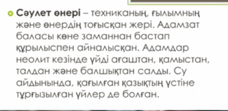 1 .Жаңа сабақты түсіндіру. Сабакта видео сабак корсетіледі.Тақырыпты «Қар кесегі » әдісі арқылы бөліктерге бөліп оқуға тапсырма береді.Топтағы балалар бір мысалды қарастырып бірге отырып талқылап өз беттерінше тусіндіреді Сәулет өнері ішіндегі көне ғимараты мен қала ғимаратын ажыратыңыз