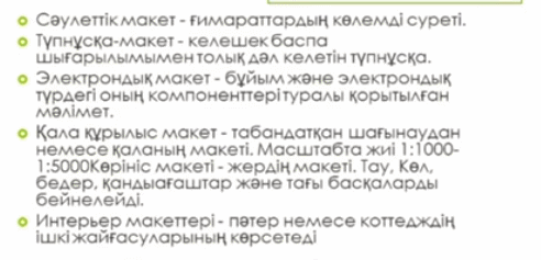 Сәулеттік нысан макеті туралы сызба үлгісін дайындау Сәлеттік нысан макет материалын құрау арқылы безендіру Бұйымның макетін тәсілдерін анықтай отырып талдау - Мәдени және тарихи жәдігерлер, қолөнер мен дизайн салалары шығармаларының материалдарын, бағытын, салыстыра білу - Бұйымның сапасын және өнімнің сыртқы көрінісін анықтайтын негізгі факторларды (эстетика, атқаратын қызметі, экономика)зерттеу, талдау |