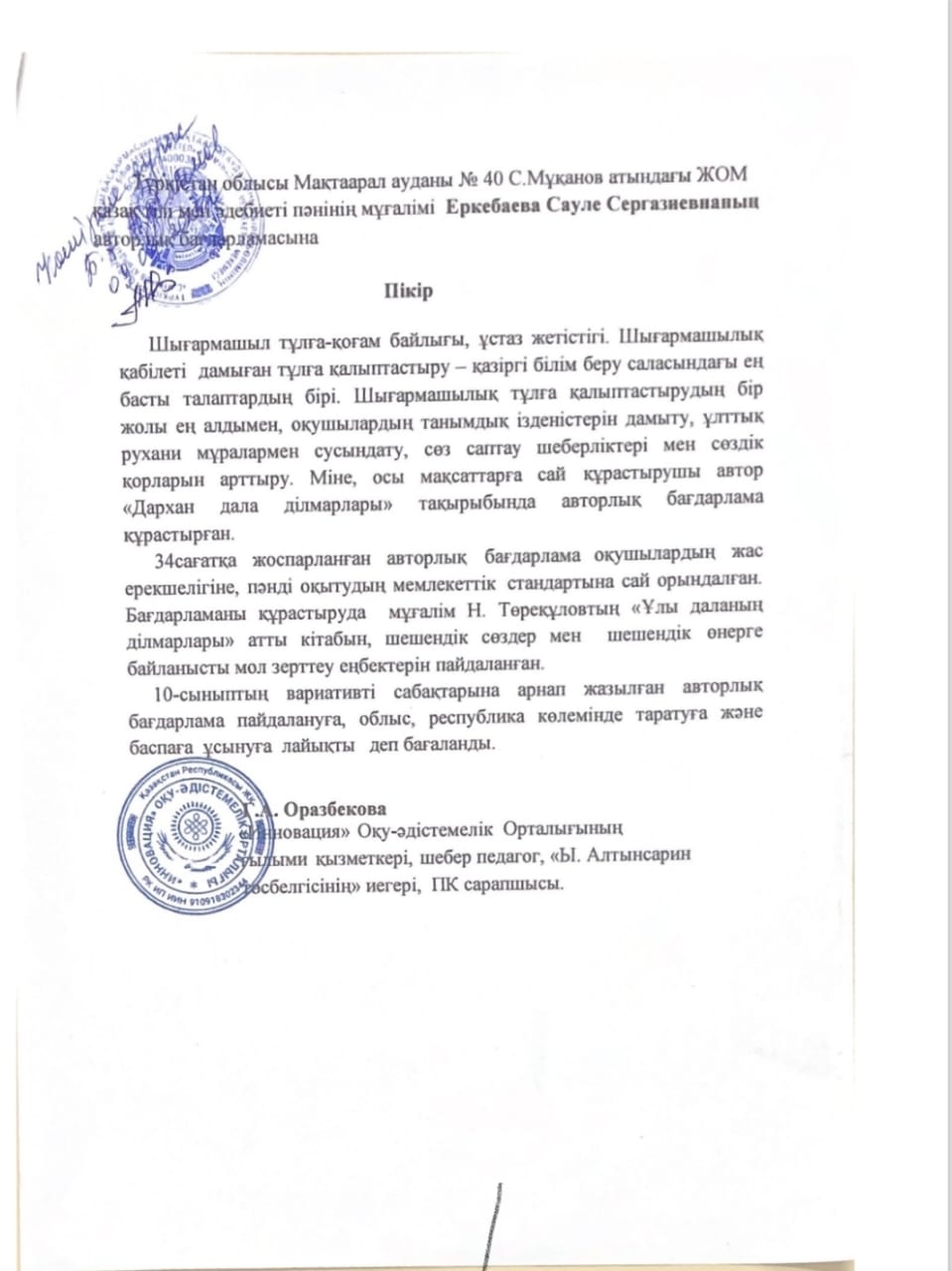 Бұл авторлық бағдарлама арқылы оқушыларға шешендік өнердің тарихи, мәдени және тілдік мәні, сондай-ақ шешендік сөздердің құрылымы мен түрлері жан-жақты таныстырылды. Бағдарлама мазмұны оқушылардың ауызша және жазбаша сөйлеу мәдениетін қалыптастыруға, оқу сауаттылығы тапсырмаларындағы негізгі ойды табуға, дәлелмен сөйлеуге үйретуге, ұлттық сөз өнеріне деген қызығушылығын арттыруға бағытталған.
