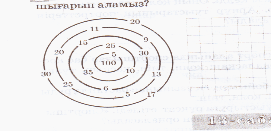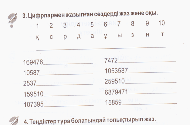1.Оқушылардың дайындығын тексеру. 0-ден 100-ге дейін аттап,кейін санау 2.Ойлы болсаң, озып көр! А )1,2,3,4,5 цифрларын бір рет қана пайдаланып, мысалды қалпына келтір. .....+.....+ =60 Б)5 жыл бұрын Ержан 8 жаста болған. 6 жылдан кейін Ержан неше жаста болған? В) Суретті жұмбақты шеш. М, 7 ,Р Г)Теңдік дұрыс болатындай етіп жақша қой. 45-15+3=25 3.Сөзжұмбақты шеш: 1.Қазақстанның Астанасы 2.Тау 3. Көл 4.Қазақтың ұлы ақыны 5.Күшіктің аты 4.Сағат 22-де жаңбыр жауып тұрса,24 сағаттан кейін күннің жарқырап тұруы мүмкін бе? А) иә б) жоқ |