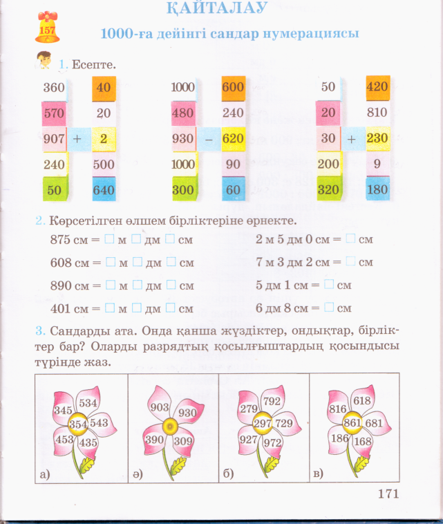 Көп таңбалы сандарды разрядтық қосылғыштарға жіктеуді үйрену; көп таңбалы сандарды оқу , жазу, салыстыру дағдыларын бекіту; ауызша, жазбаша есептеу дағдыларын жетілдіру ; құрама есептер шығара білуге үйрету. |