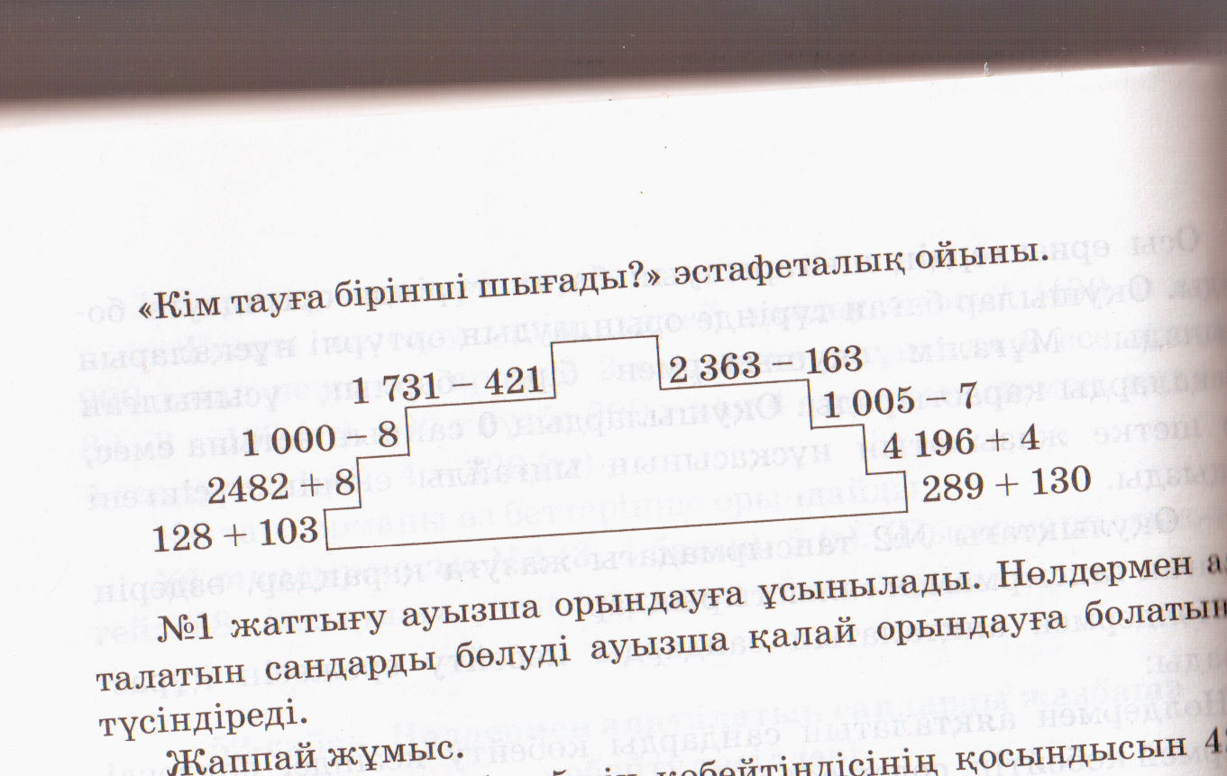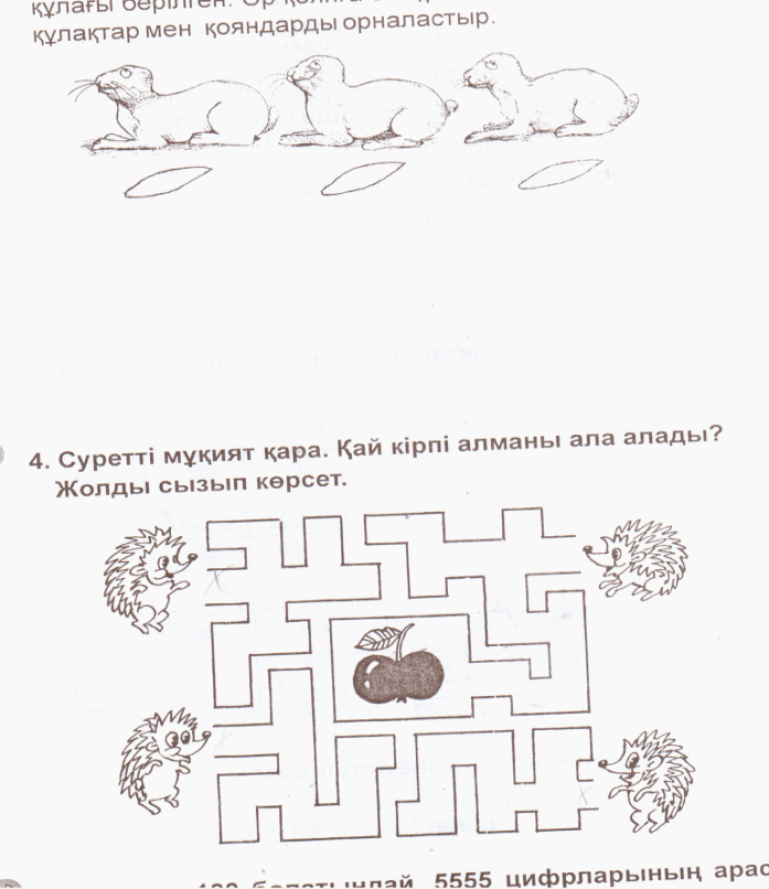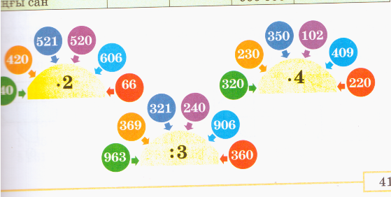 1.Мұғалім мысалдар тізбегін оқиды,балалар ауызша санайды да ,жауабын көрсетеді немесе бірнеше бала дауыстап жауап береді,сосын тексеру орындалады. 360 : 9 + 28 : 2 – 2 х 1 + 38 : 2 Жауабы: 35 30 + 20 х 2 :20 + 19 :8 х 60 Жауабы: 180 90 + 30 : 3 х 2 – 8 : 9 х 11 – 12 Жауабы: 76 «Компьютер » не істеді? (есептеді,амалдарды орындады). Қандай амалдар орындады? Қосу,азайту,көбейту ,бөлу 2.Суретті мұқият қарап,қай кірпі алманы тез алады? Жолды сызып көрсету.