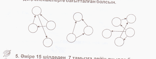 №2. Жұмбақ есепті шеш. Ағашта саңырауқұлақ кепті, Жаңбыр жауып, оны жұмсартып кетті. 40-қызыл, 8-і сары, 20-ы жасыл еді, Тиін мен тышқан 7-ін жеді, Қалды екен нешеуі ағашта енді? Жауабы:______________________________________________ №3. Ойлан тап! №4. Есепті шығар. 1. Бір жылда неше жексенбі болуы мүмкін? Жауабы: 53 2. Арман дүйсенбі күні 1 есеп шығарды, сейсенбі күні 2 есеп, сәрсенбі күні 3 есеп және ары қарай келесі күндері де кете береді. Сонда Арман жексенбі күні неше есеп шығарды? Жауабы: 7 есеп шығарды. 3. Ерзат саяжайдан алма жинады. Барлық жиналған алманың үштен бір бөлігін, яғни 12 алманы Айгүлге, ал қалғанының үштен бір бөлігін және 1 алманы Әйгерімге берді. Ерзаттың өзінде 15 алма қалды. Ерзат қанша алма жинаған еді? Жауабы: 12•3=36 36-12=24 24:3=8 36-12-8-1=15 Ерзат 36 алма жинады. №5. Ойлан тап!