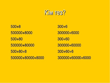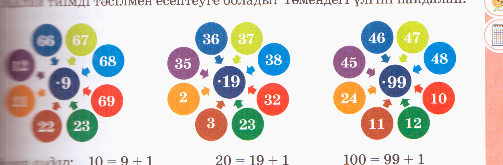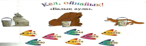 №4. Есепті шығар. 1. Спортшы бірінші күні 10 км жүгірді. Содан соң күнде 2 км артық жүгіріп жүрді. Спротшы 3-і күні неше км жүгірді?Жауабы:3-күні 14 километр жүрді. 2. Мотоцикл жүргізушісі ауылға келе жатқанда жолдан өзіне қарсы үш жеңіл машина және бір камазды кездестірді. Ауылға неше машина бара жатыр? Жауабы: Ауылға 1 машина бара жатыр. 3. Суретші Худабеднов бір айда 42 картина салды. Олардың 17-і орман, 9-ы өзен, ал 13-і орманда, өзенде салынған. Қалған картинкаларда түсініксіз суреттер бар. Қанша түсініксіз суреттер бар? Жауабы: 42-17-9-13=3 Түсініксіз 3 сурет бар. №5. Өрнектің мәнін тап. |