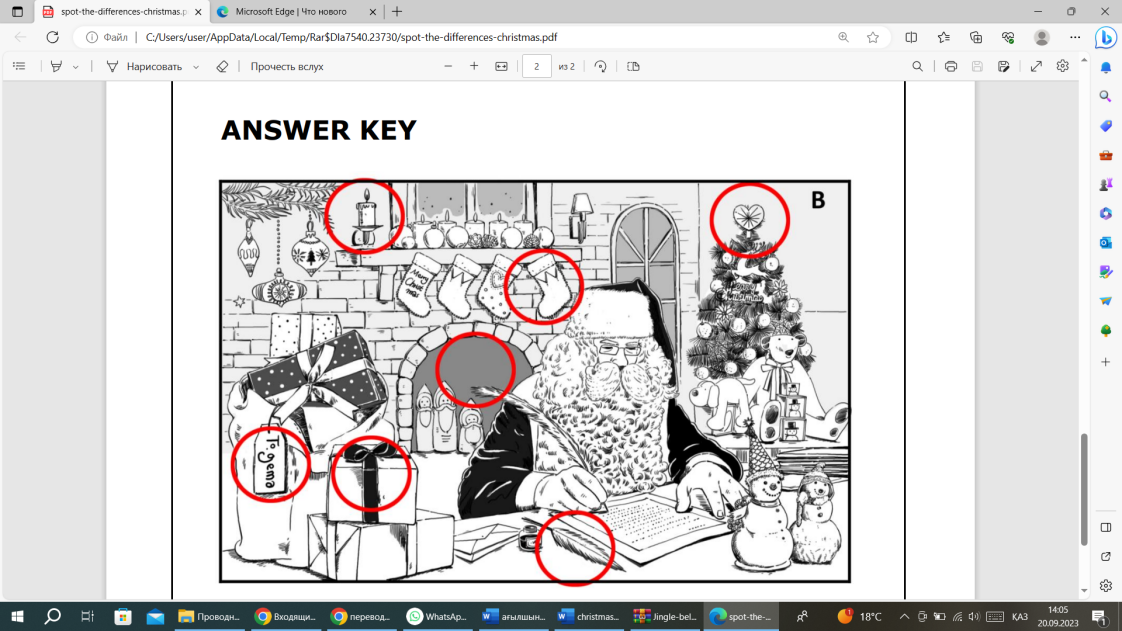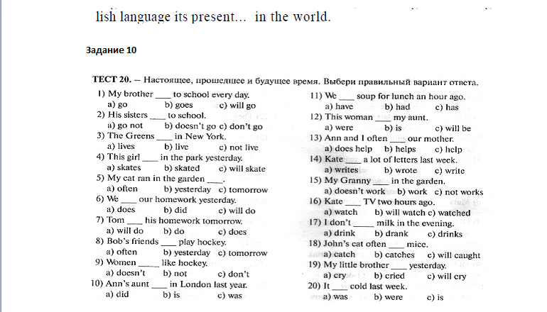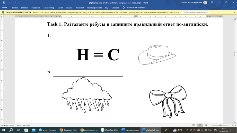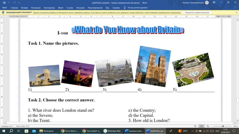Task 2. Choose the correct answer. 1. What river does London stand on? a) the Severn; b) the Trent; c) the Thames; d) the Potomac. 2. How is the most important business part of London called? a) the Town; b) the City; c) the Country; d) the Capital. 3. How old is London? a) 1000; b)1500; c) 2000; d) 2500. 4. What is the largest park in London? a) Green Park; b) St. James Park; c) Hyde Park; d) Regent's Park. 5. Who is the present monarch in Great Britain? a) Prince Charles; b) Prince Henry; c) Queen Elizabeth I; d) Queen Elizabeth II. 6. How many countries does the UK consist of? a)3; b)4; c) 5; d)6. 7. What weather is the most common in Great Britain? a) rainy; b)sunny; c) snowy; d) frosty. 8. Which of these rivers is not situated in Great Britain? a) the Severn; b) the Trent; c) the Potomac; d) the Thames. II-топ Task 1. Match English proverbs with their Russian equivalents. 1. East or West, home is best. 2. Better a lean peace than a fat victory. 3. Business before pleasure. 4. Don't trouble troubles till troubles trouble you. 5. Every bird likes its own nest. 6. Friend in need is a friend indeed. 7. So many men, so many minds. 8. Tastes differ. a) Худой мир – лучше доброй войны. b) Сделал дело – гуляй смело. c) О вкусах не спорят. d) Не буди лихо пока оно тихо. e) Всяк кулик свое болото хвалит f) Друзья познаются в беде. g) В гостях хорошо, а дома лучше. h) Сколько голов – столько умов IV кезең: Мықты болсаң шешіп көр