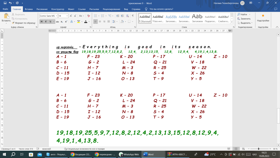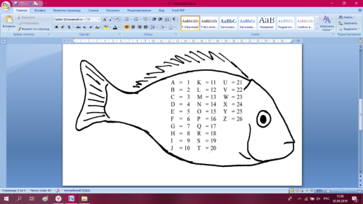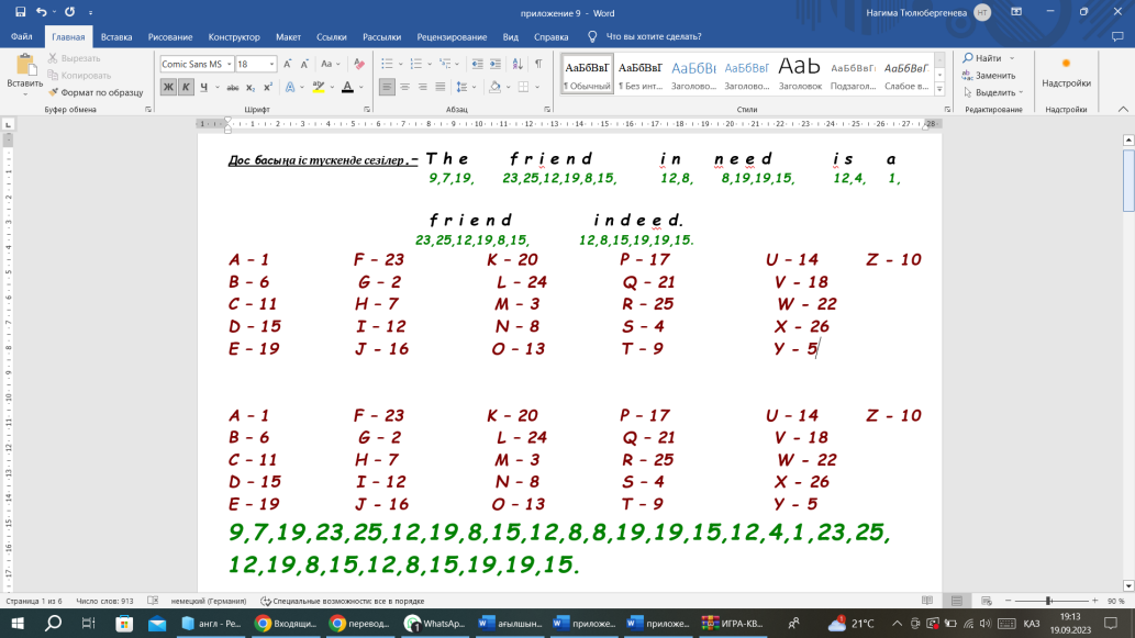 3)Друг познается в беде.– T h e f r i e n d i s n e e d i s a f r i e n d i n d e e d. «Досыңды қиналғанда бір сына, қуанғанда бір сына. 9,7,19, 23,25,12,19,8,15, 12,8, 8,19,19,15, 12,4, 1, 23,25,12,19,8,15, 12,8,15,19,19,15. A – 1 F – 23 K – 20 P – 17 U – 14 Z - 10 B – 6 G – 2 L – 24 Q – 21 V - 18 C – 11 H – 7 M – 3 R – 25 W - 22 D – 15 I – 12 N – 8 S – 4 X - 26 E – 19 J - 16 O – 13 T – 9 Y – 5
