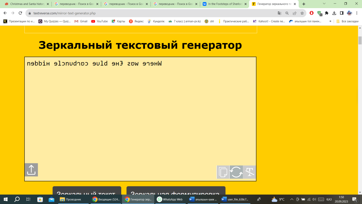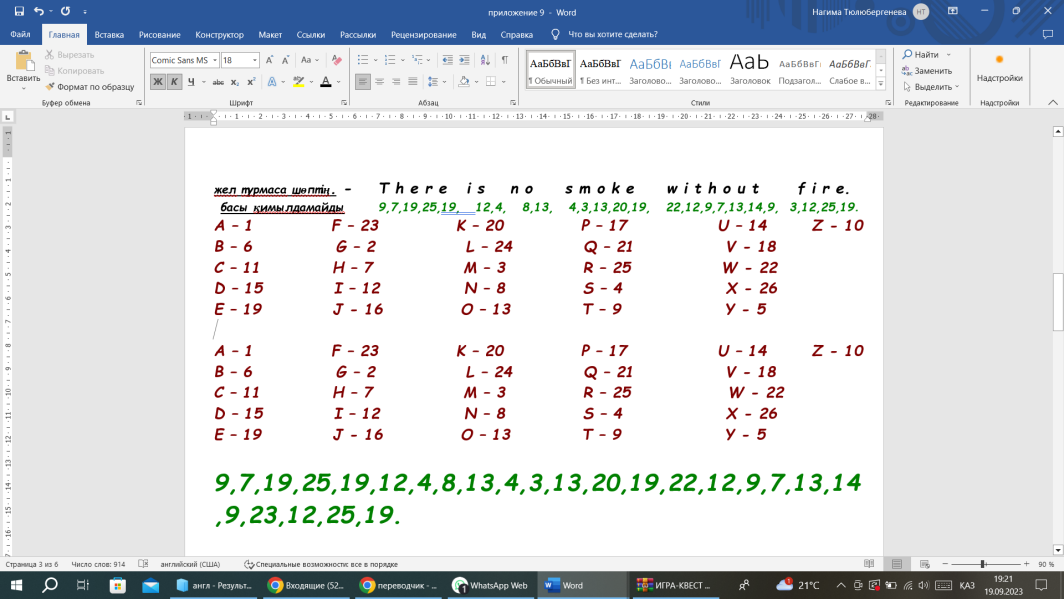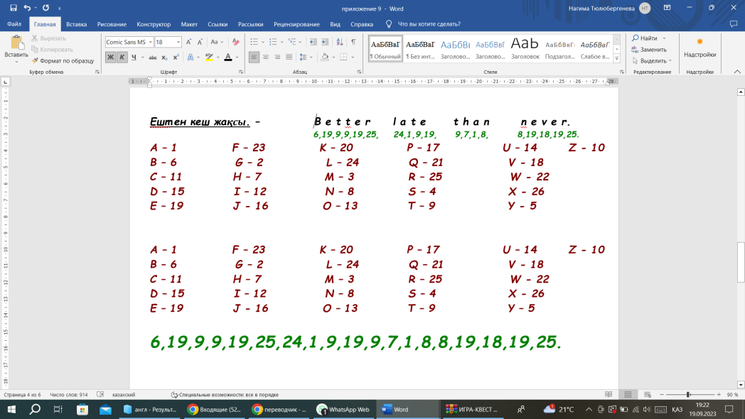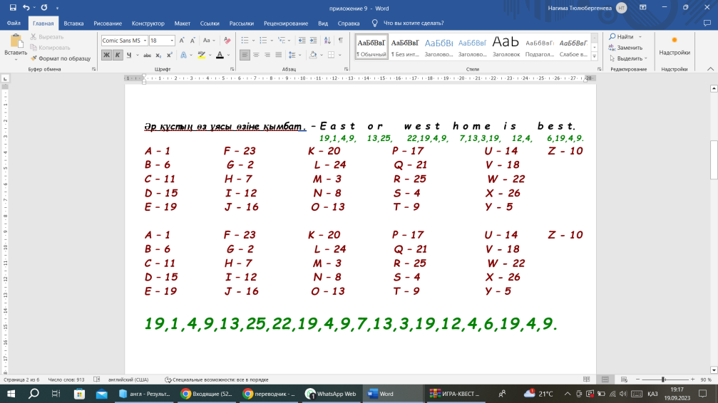 2)В гостях хорошо, а дома лучше. – E a s t o r w e s t h o m e i s b e s t. Өз үйім –өлең төсегім. 19,1,4,9, 13,25, 22,19,4,9, 7,13,3,19, 12,4, 6,19,4,9. A – 1 F – 23 K – 20 P – 17 U – 14 Z - 10 B – 6 G – 2 L – 24 Q – 21 V - 18 C – 11 H – 7 M – 3 R – 25 W - 22 D – 15 I – 12 N – 8 S – 4 X - 26 E – 19 J - 16 O – 13 T – 9 Y – 5