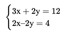 {2х+3у=12; 3х–3у=6} → (3,6;1,6)