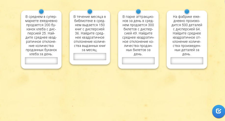 Задача №3. Метод «» Задача 1. "Производство кумыса" На предприятии по производству кумыса вероятность того, что бутылка будет заполнена точно до метки, равна 0,9. Найти вероятность того, что из 6 случайно выбранных бутылок: а) ровно 5 заполнены правильно б) хотя бы 5 заполнены правильно в) все заполнены правильно Задача 2. "Ювелирная мастерская" Мастер изготавливает национальные серебряные украшения. Вероятность изготовления изделия высшего качества 0,85. В партии 8 изделий. Найти: а) наивероятнейшее число изделий высшего качества б) вероятность получения наивероятнейшего числа изделий высшего качества в) математическое ожидание числа качественных изделий Задача 3. "Стрельба из лука" На соревнованиях по стрельбе из традиционного лука вероятность попадания в цель для опытного лучника составляет 0,7. Лучник делает 10 выстрелов. Найти: а) вероятность 7 попаданий б) математическое ожидание числа попаданий в) дисперсию числа попаданий Задача 4. "Национальные орнаменты" При вышивании национального орнамента вероятность правильного выполнения одного элемента равна 0,95. Мастерица выполняет 12 элементов. Найти: а) вероятность того, что все элементы выполнены правильно б) вероятность того, что правильно выполнено не менее 10 элементов в) наивероятнейшее число правильно выполненных элементов Задача 5. "Сборка юрты" При установке юрты вероятность правильной установки одного кереге (решетчатой секции) равна 0,8. Всего устанавливается 6 кереге. Определить: а) вероятность того, что все кереге установлены правильно б) математическое ожидание числа правильно установленных кереге в) среднее квадратическое отклонение |