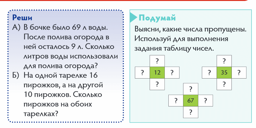Открытие нового Педагог предлагает проговорить условие и вопрос получившейся задачи. Дети дополняют схему, вносят числовые данные. На доске с комментированием составляют краткую запись и решение задачи. Первичное закрепление с проговариванием Проводит на материале 3 (в). Педагог уточняет: – Сколько действий в задаче по первой схеме? – Как изменилась схема (условие, вопрос) задачи? – Сколько действий в этой задаче? Дети комментируют план решения задачи, само решение выполняют самостоятельно с проверкой по критериям. Критерии оценивания: Могу прочитать задачу. Могу определить план решения. Могу заполнить схему-модель. Могу правильно выполнить два действия. Могу записать выражение. Могу записать ответ. Применение нового Задание аналогичное заданию учебника на индивидуальных карточках. Например: В гости к Алие пришло 2 мальчика, а девочек – в 4 раза больше. Поставь вопрос так, чтобы задача решалась в 2 действия. Запиши решение и ответ задачи. Работу над ранее изученным проводит на материале №1,2,4 в тетради. №5 в учебнике – практическая работа. Для организации исследования на пару учащихся можно выдать 20 фишек (счетный материал, фасоль, бусины и т.п.). Дети на основе практических действий определяют количество испеченных пирожков (20 – 10 – 2 = 8) |