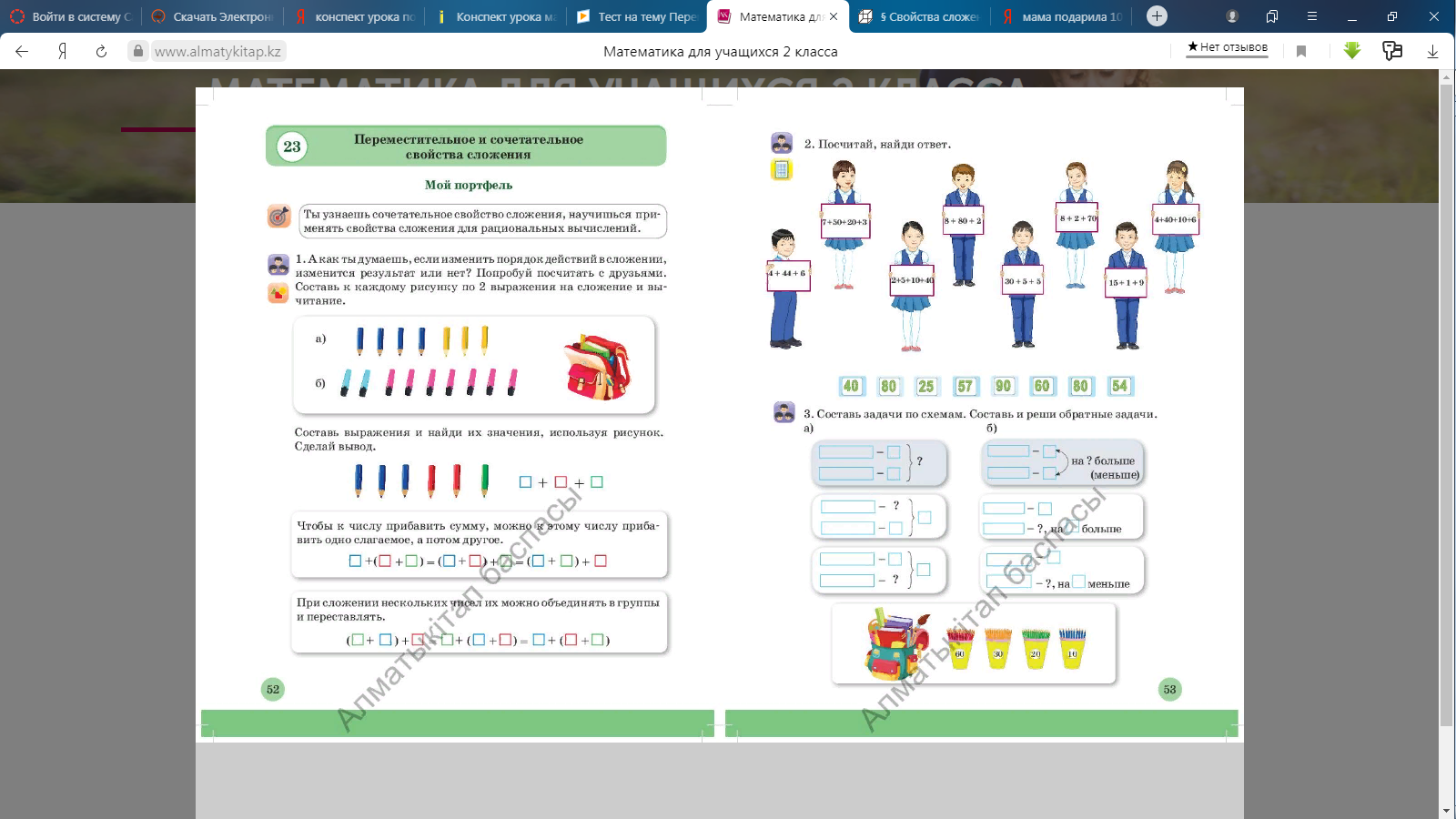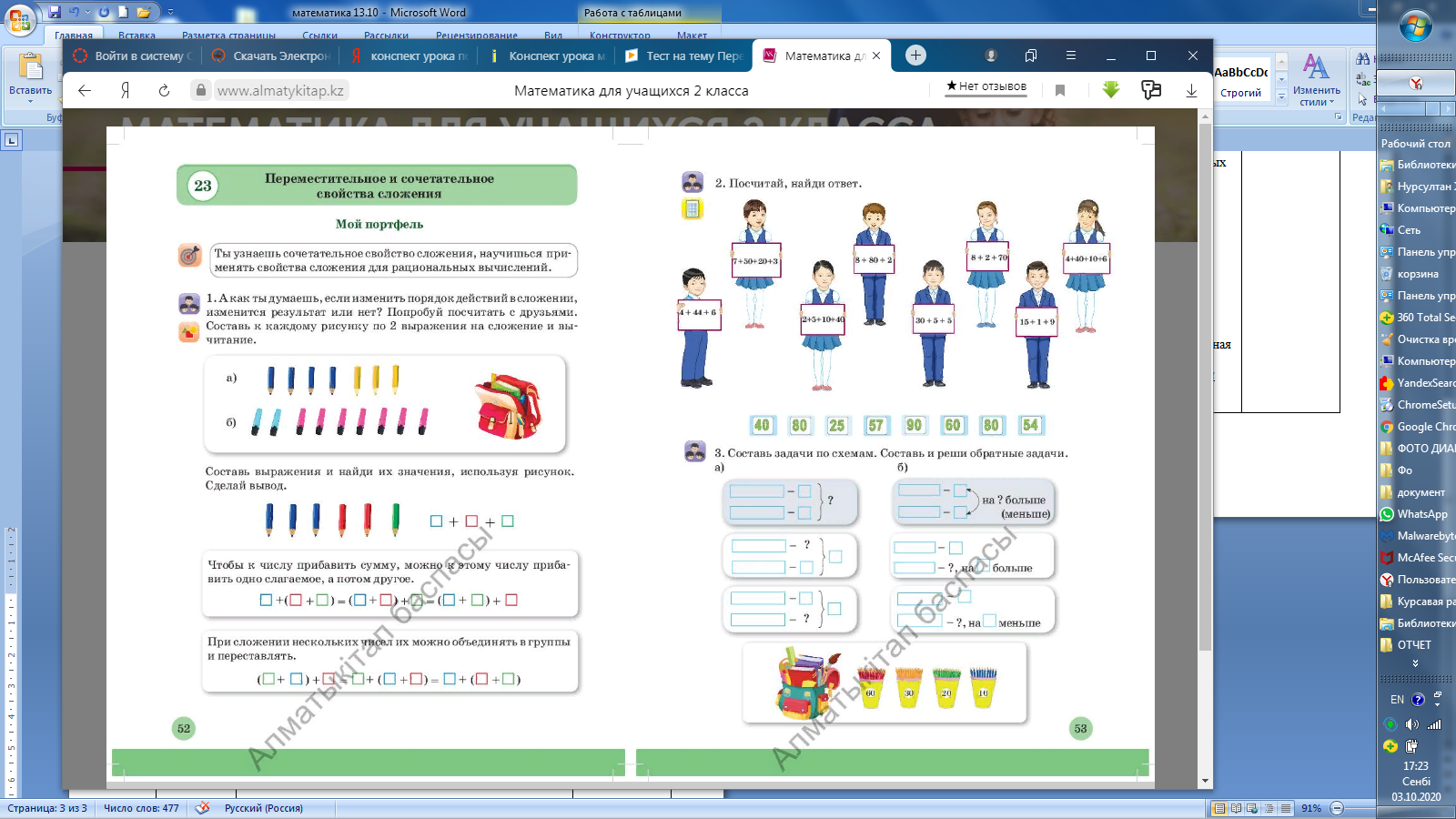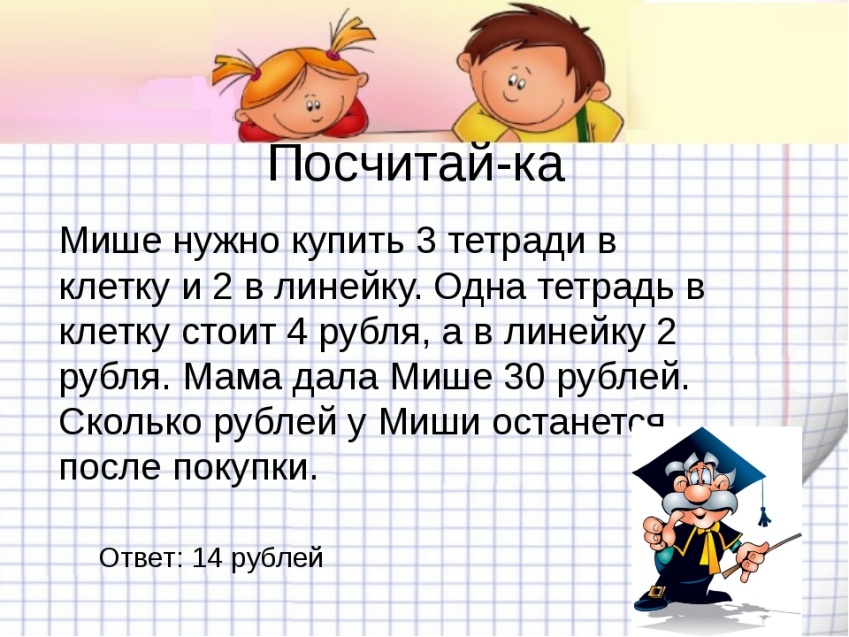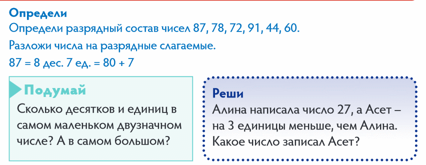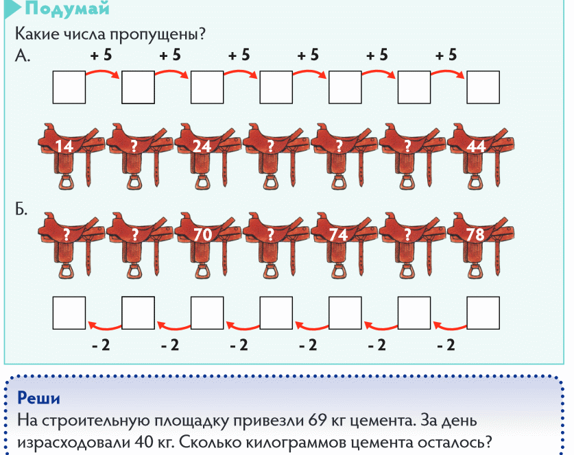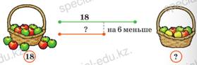 Мотивация Педагог читает пословицы задания №1 в учебнике: Без лени трудись, без устали учись. Где нет дружбы, там нет успеха. Педагог спрашивает детей: – Как они понимают смысл пословиц? – Почему говорят, что пословицы – мудрость народа? Предлагает выполнить задание №1 в тетради по вариантам – разгадать пословицы. Сегодня на уроке мы не будем лениться, будем работать все вместе и достигнем хороших результатов. Актуализация Математический диктант. В диктант можно включить разные задачи в 1 действие известных видов. Например: 1. Ване сейчас 19 лет. Сколько лет ему будет через 5 лет? 2. Чтобы заплатить за маркер Максат отсчитал монеты в 20 тенге, 50 тенге и 5 тенге. Сколько стоит маркер? 3. На площадке играло 6 мальчиков, а девочек в 3 раза больше. Сколько девочек играло на площадке? 4. На уроках труда Тимур сделал 18 счетных палочек. Из них 12 палочек были красные, а остальные синие. Сколько синих палочек сделал Тимур на уроке труда? 5. Стол накрыли к празднику на 16 персон, а пришло 14 человек. Сколько на столе лишних приборов, которые необходимо убрать? 6. На озере плавало 8 лебедей и несколько уток. Всего было 20 птиц. Сколько уток плавало на озере? 7. На одной стороне улицы посадили 10 деревьев, а на другой на 8 деревьев больше. Сколько деревьев посадили на второй стороне улицы? 8. В коробке было 20 конфет. 4 конфеты съели за завтраком. Сколько конфет осталось в коробке? 9. У Марата 16 машинок, ему подарили еще 3. Сколько машинок стало у Марата? 10. У Марата 16 машинок, а у его брата – в 2 раза меньше. Сколько машинок у брата Марата? 11. На верхней полке было 5 книг, а на нижней столько же и еще 4 книги. Сколько книг было на нижней полке? 12. В одном выставочном зале висело 16 картин, а в другом на 4 картины меньше. Сколько картин висело во втором выставочном зале? Постановка цели Предлагает составить простые задачи по рисункам и схемам. Далее педагог уточняет можно ли составить задачи в два действия. |