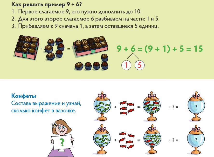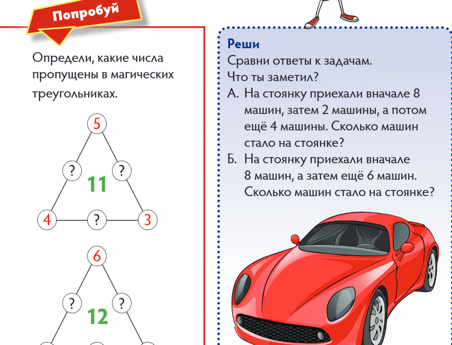 Мотивация Педагог организует беседу о героях сказок. – За что вам нравятся герои сказок? (они добрые и смелые) – А какие качества помогают им в борьбе со злом? (находчивость и смекалка) – Сегодня на уроке нам тоже потребуется смекалка и находчивость. Актуализация Предлагает выполнить задание №1 в учебнике. Постановка цели (проблемная ситуация) Организует учащихся по исследованию проблемной ситуации. Дети читают текст задачи №2 (а). Педагог обращает внимание детей на ключевые слова в условии задачи. Дети совместно с педагогом с опорой на модель задачи определяют отношения между данными задачи. – Какое из чисел больше, а какое меньше? Формулирует цель: научиться решать задачи с косвенным вопросом. |