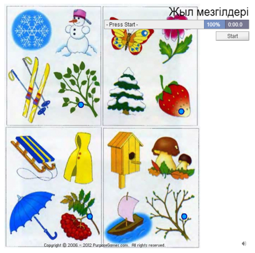 Ширату /Ұ/ -Қайырлы таң, менің білім құған шәкірттерім! Барлығымыз ортаға шеңбер боп тұрайық! «Қай кезде не істейсің?» ойыны. Барлық оқушылар шеңбер болып тұрады. Мұғалім белгісімен –ҚЫС! ЖАЗ! КҮЗ! КӨКТЕМ! дегенде шеңбердегі оқушылар өздері сол жыл мезгілінде ұнататын қимылды әрекеттер жасайды. -Тамаша! Бәрің де дұрыс әрі қызықты қимылдар көрсеттіңіздер!