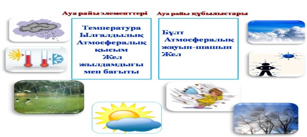 Ауа райы – тропосфераның белгілі бір жердегі қысқа мерзімді жай-күйі. Ауа райының әртүрлі болатынын білдіңіздер. Ауа райының әртүрлі болуына метерологиялық элементтер мен құбылыстар әсер етеді. Тақтадағы сызба суреттерге назар аударайық |