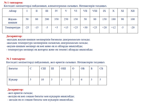 Өз ойын дұрыс мағынада білдіріп, талқылауға белсенділікпен қатысқан оқушыға «Жарайсың!» деген мадақтау сөзімен ынталандыру Дескриптор: -атмосфералық ұғымдар мен құралдардың дұрыс жауабын анықтайды. Дескриптор: -атмосфералық ұғымдар мен құралдарды дұрыс жауабымен сәйкестендіреді. Дұрыс жауап үшін 3 балл Дескриптор: -ауа райын алдын-ала зерттеудің маңызына дәлелдер жазады. Әр дұрыс жауапқа 1 балл, жалпы 3 балл. |