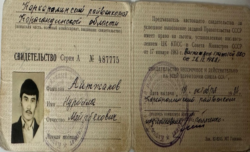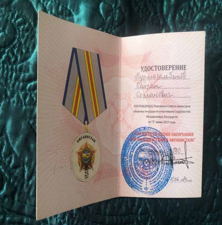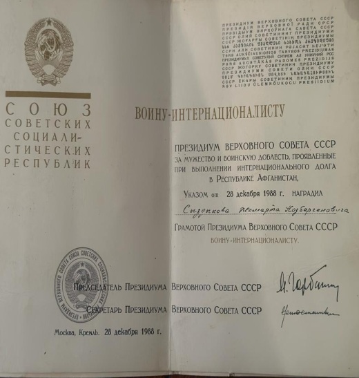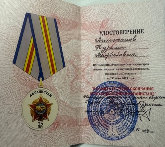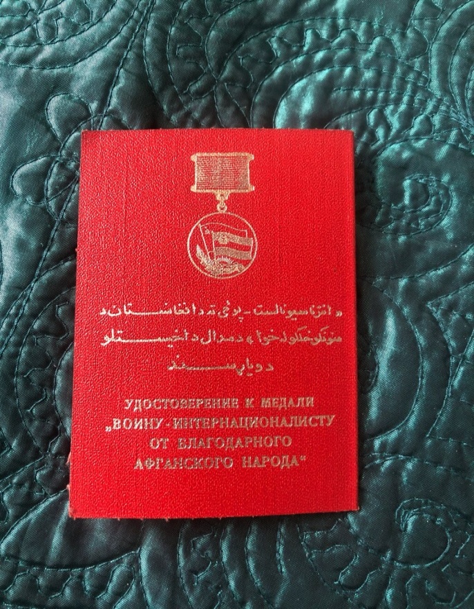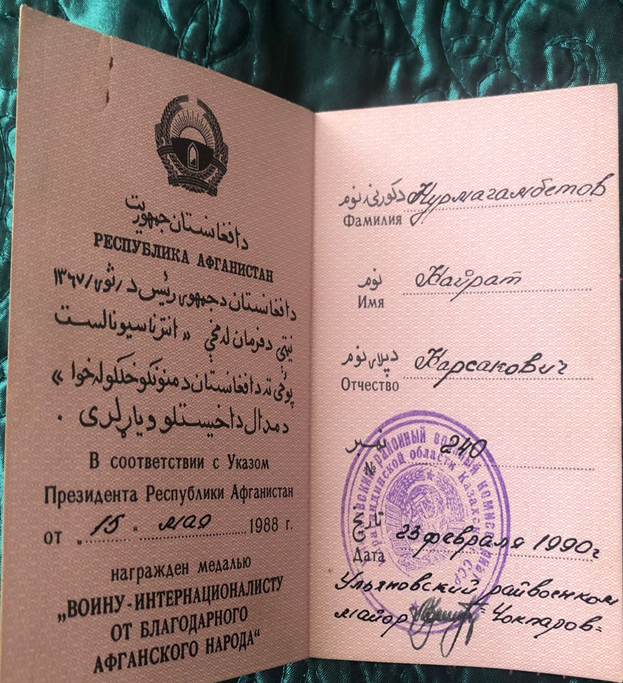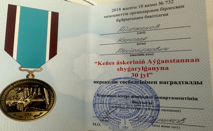 23.02.1990 жыл «Интернационалист жауынгерге алғыс білдірген ауған халқынан» медальмен наградталды