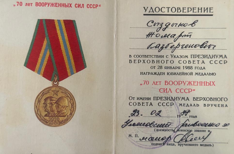 23.02.1988 жыл «КСРО Қарулы Күштеріне 70 жыл» мерейтойлық медальмен наградталды.