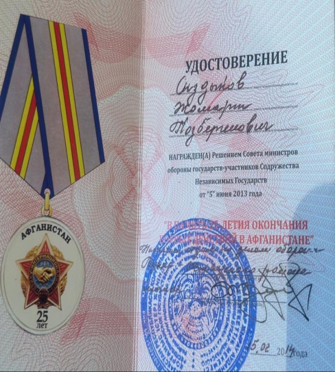 15.02.2014 жылы «Кеңес әскерінің Ауғанстаннан шығарылғанына 25 жыл» мерекелік төсбелгісімен наградталды.